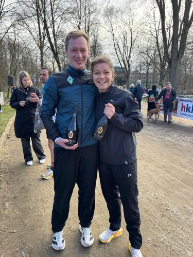 Im Ziel konnte er diesen Erfolg unter anderem mit seiner Freundin Anna Pape feiern, die zuvor in der „Kleinen Serie“, bei der jeweils 10 Kilometer zu laufen waren, den Bronzerang erzielen konnte. Anna steigerte sich dabei von Lauf zu Lauf und kam beim dritten 10 km Start nach 47:47 min im Ziel an. Ihre Gesamtzeit betrug 2:26:44, womit sie völlig verdient und mit mehr als sieben Minuten Vorsprung Dritte wurde. Verdienter Lohn bei der Siegerehrung war eine Flasche Sekt, die von Thomas Adick von bremenracing überreicht wurde.
